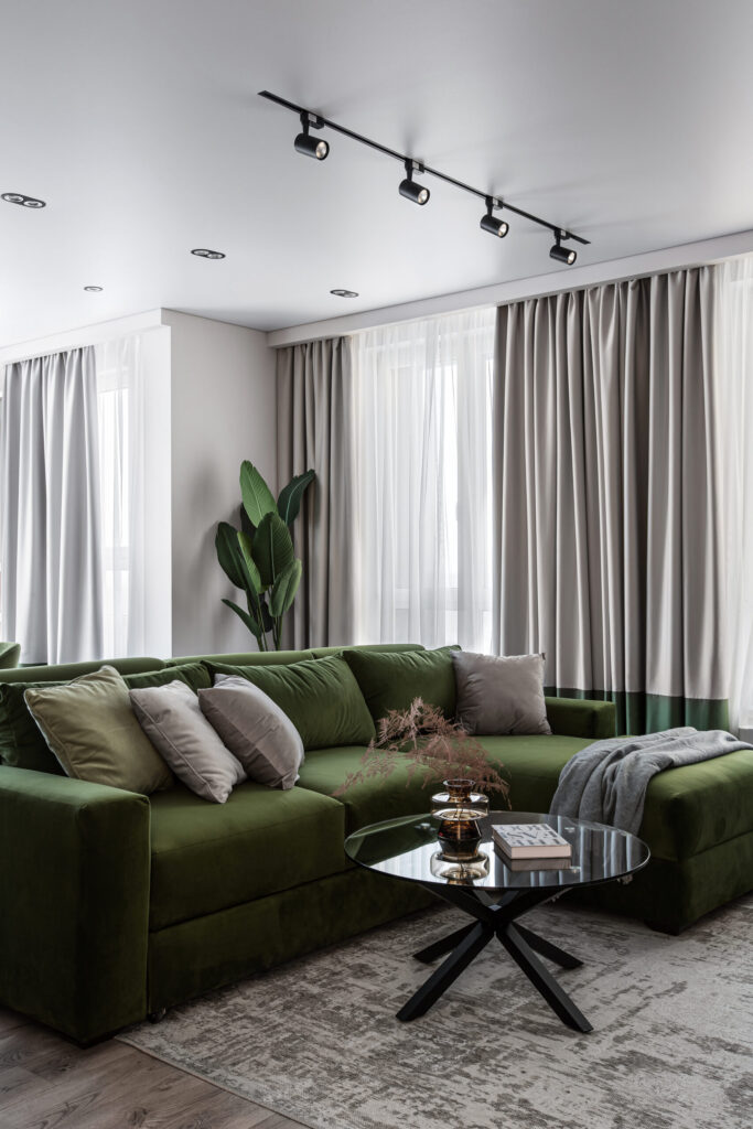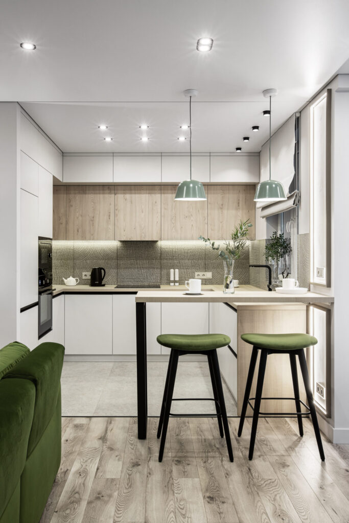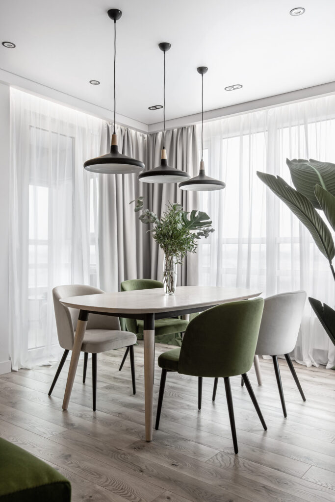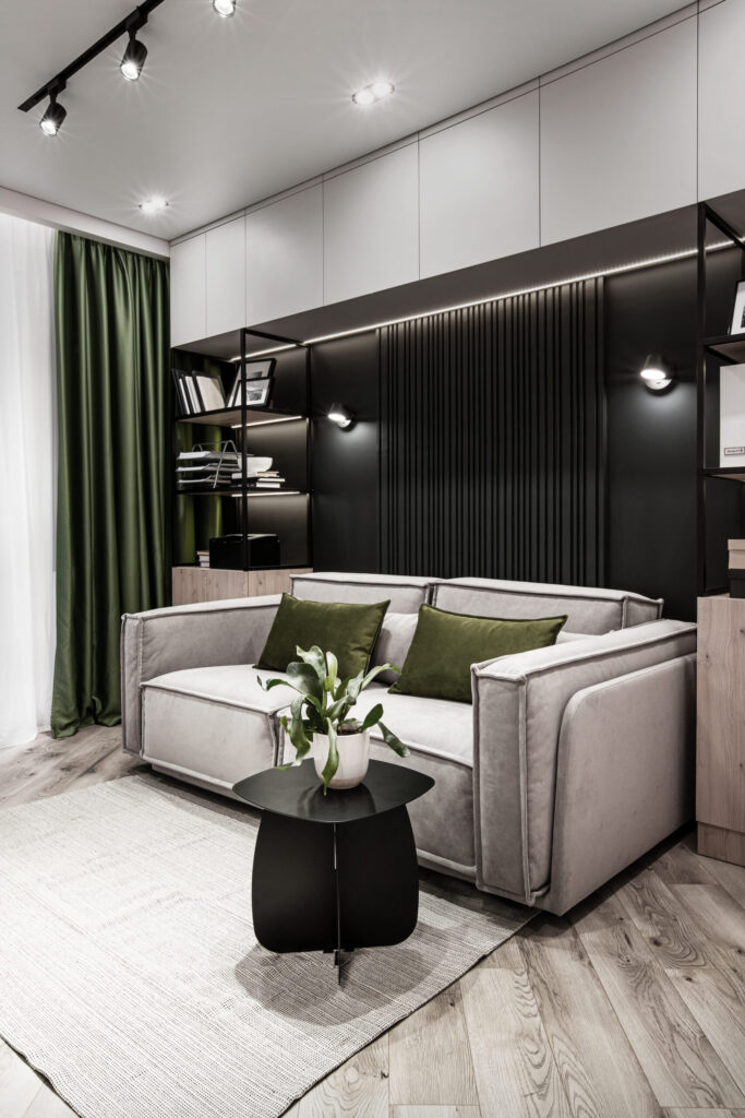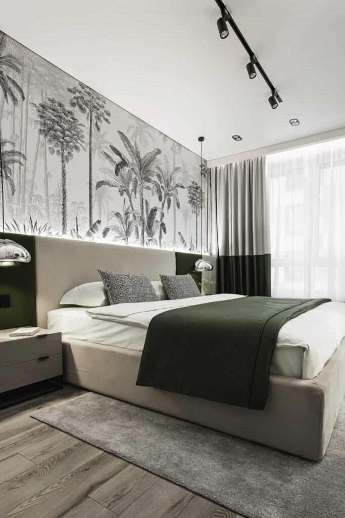 В основу проекта легли растительные мотивы: травянисто зеленый стал акцентом в текстиле. Стены напротив – стали теплым из молочного и серо-коричневого оттенков. А завершает идею природных мотивов – древесный рисунок, используемый в мебели и на полу, имитирующий натуральную доску.