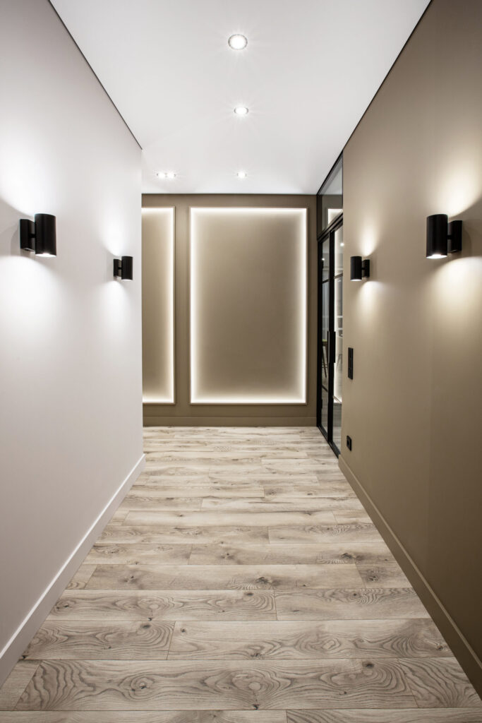 Кстати, несмотря на интересные решения в отделке — мы старались оптимизировать бюджет нашего заказчика. Например, в пользу грамотного распределения ресурсов мы отказались от дорогих акцентных светильников, потолки сделали натяжными, а на полу использовали ламинат в сочетании с керамогранитом.