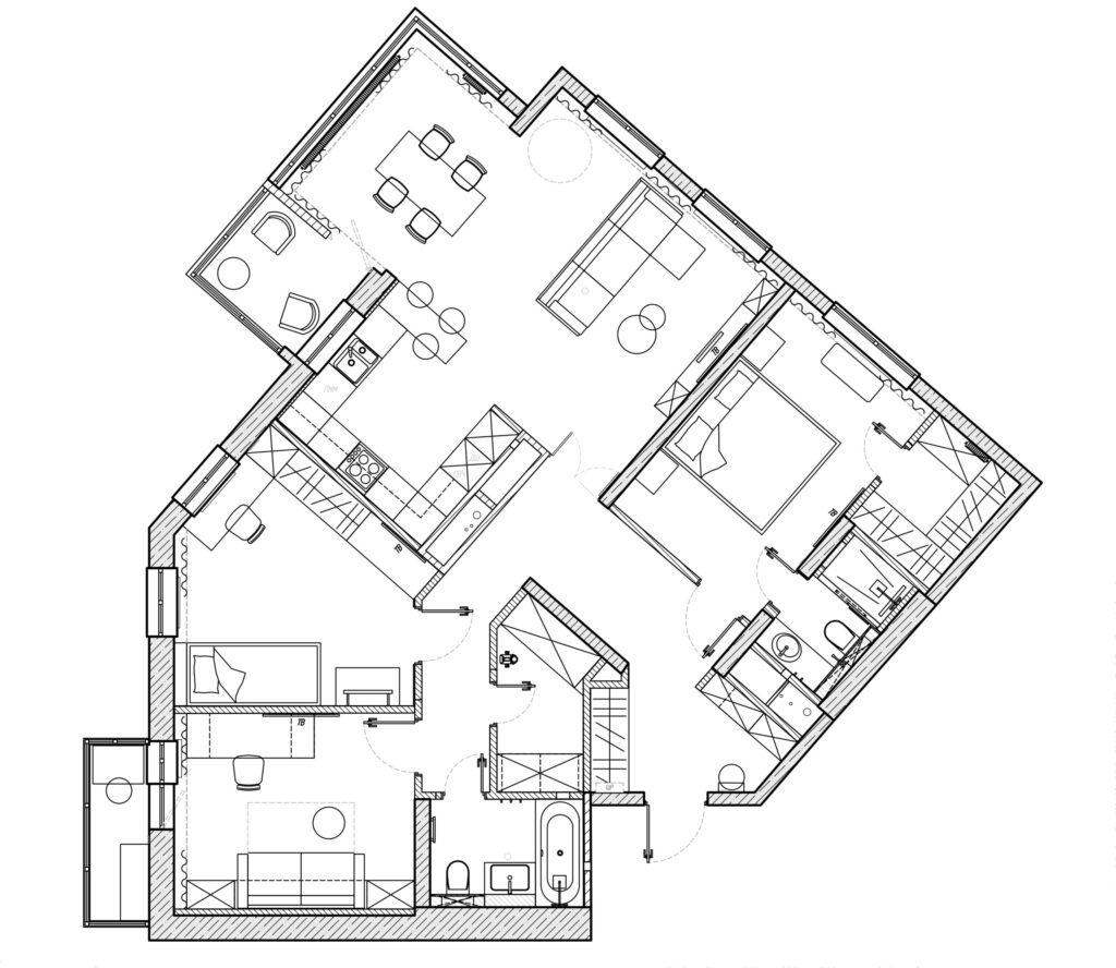 Разместить зоны так, чтобы мастер блок был максимально удален от детской комнаты. Сохранить пространство, особенно в зоне кухни-гостиной и создать теплый интерьер, который будет радовать глаз в дождливые Питерские дни.