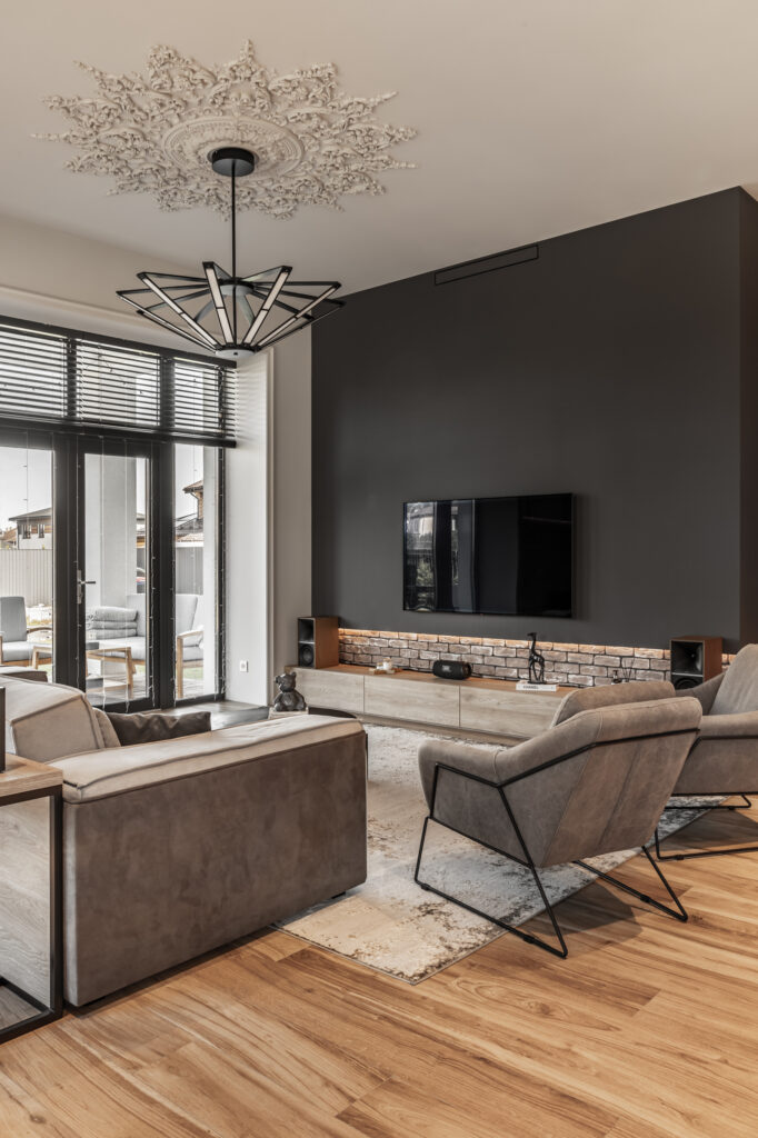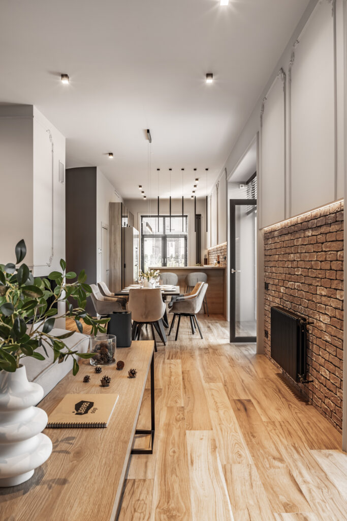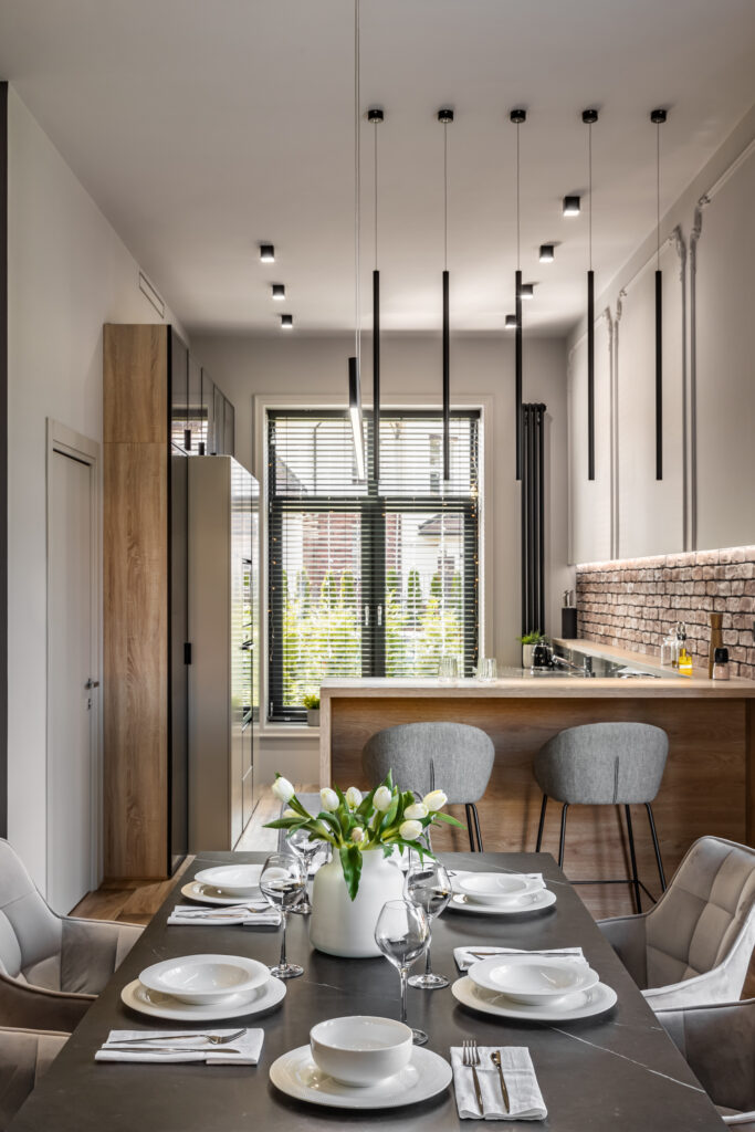Достаточно непростую задачу мы решили неординарно с помощью смешения стилей: нижнюю часть стен мы выложили декоративным кирпичом, а верхнюю и потолок украсили классическими молдингами и ажурной розеткой. Зона кухни-гостиной и столовой занимает практически полностью 1 этаж дома, поэтому мы старались сделать так, чтобы они перетекали одна в другую: кухня выглядит непривычно, потому что мы отказались от верхних шкафов, но при этом в отделке стен предусмотрели подсветку кухонной зоны, которая продолжается и на стенах в столовой и гостиной.