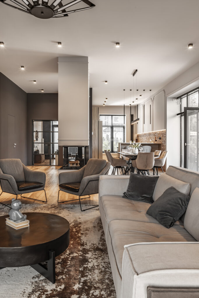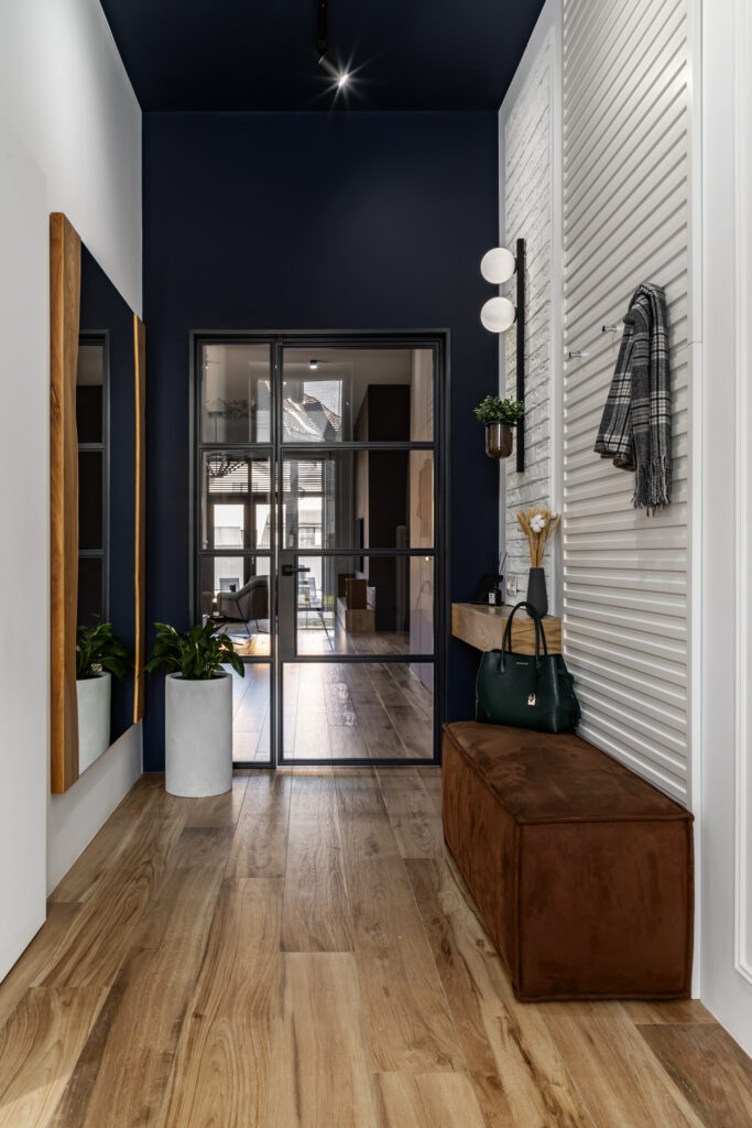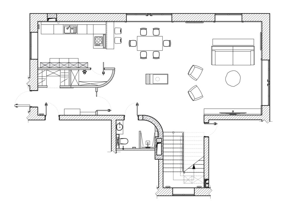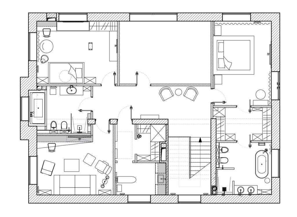 Создать внутреннее пространство дома с элементами стиля Loft, которое не будет спорить с внешней архитектурой дома в духе неоклассики.